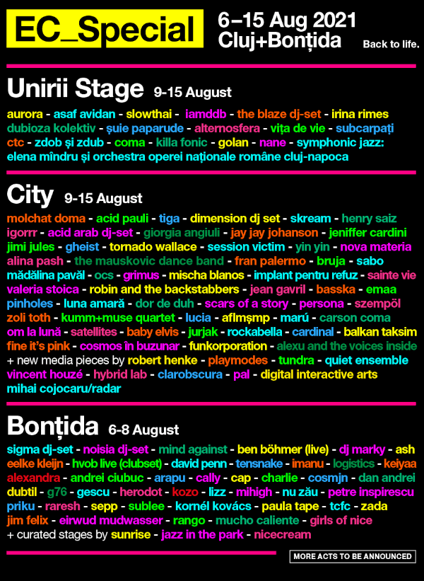 AURORA, Asaf Avidan, slowthai, The Blaze DJ-set, Sigma DJ-set, Noisia DJ-set, DJ Marky, Molchat Doma, Acid Pauli, IAMDDB, Subcarpați, Irina Rimes and many others.
